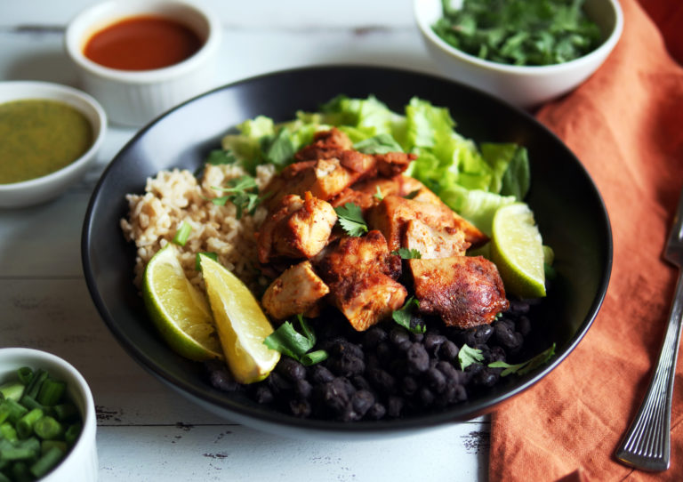 Marinated grilled chicken atop a bed of quinoa, slow baked black beans, caramelized yams and plantains, and fresh herbs finished with a swirl of jerk sauce.