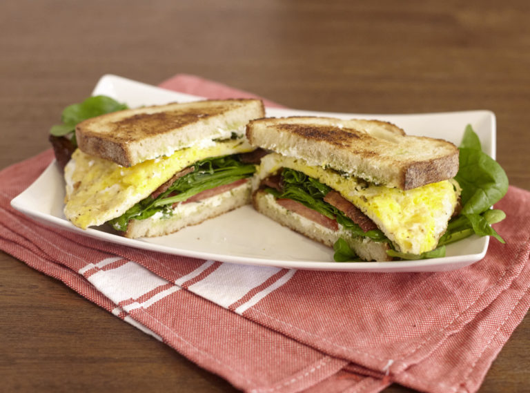 Eggs sandwiched with layers of baby spinach, tomatoes, and goat cheese, plus a choice of ham or bacon